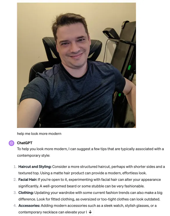 Fashion faux pas can be a thing of the past with ChatGPT as your style consultant. Show it a photo, and it becomes your personal Anna Wintour, advising you on how to jazz up that wardrobe to look more modern, or perhaps add a touch of class with a classic twist.