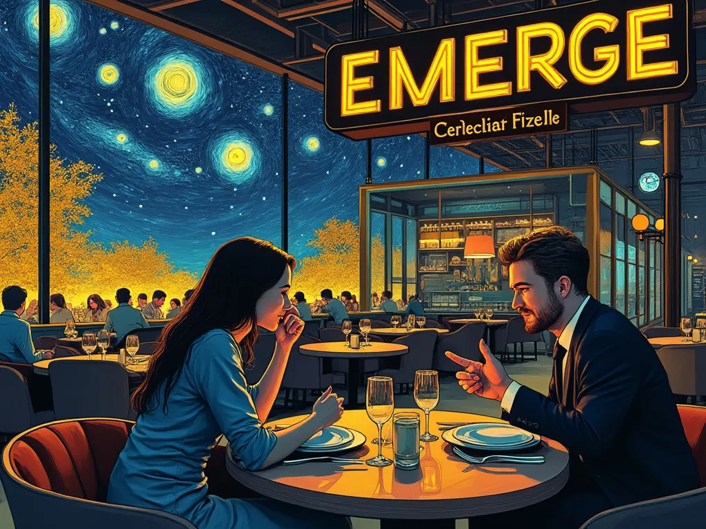 Prompt: A man and a woman having dinner in a futuristic restaurant, illustration in the style of Vincent Van Gogh. The restaurant has a sign saying "Welcome to Emerge, by Decrypt."