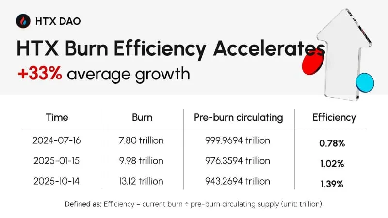 Data indicates that $HTX’s burn efficiency has increased over the past year, rising from 0.78% in Q2 2024 to 1.39% in Q3 2025, representing an average quarterly growth rate of approximately 33%. The figures suggest that the $HTX burn mechanism has become more effective in reducing token supply over time.