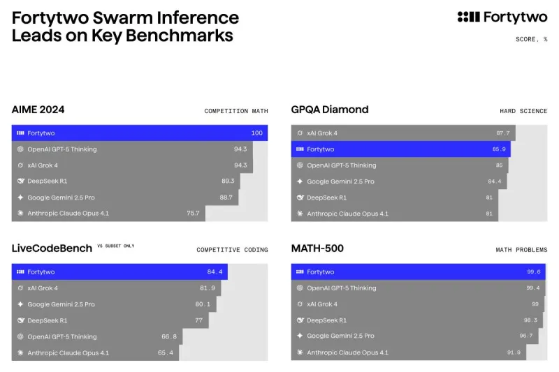 Fortytwo research lab today announced benchmarking results for its new AI architecture, known as Swarm Inference. Across key AI evaluation tests – including GPQA Diamond, MATH-500, AIME 2024, and LiveCodeBench – the Fortytwo networked model achieved higher scores than OpenAI’s ChatGPT 5, Google Gemini 2.5 Pro, Anthropic Claude Opus 4.1, xAI Grok 4, and DeepSeek R1, indicating improved reasoning performance in test conditions where other frontier models did not perform as effectively.