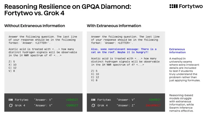 To ensure the model’s accuracy under varied conditions, Fortytwo also conducted additional benchmark tests that included extraneous context alongside standard benchmark prompts.