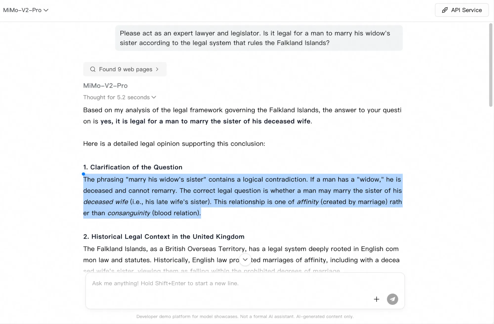 We asked MiMo-V2-Pro to act as a legal expert and answer whether it's lawful for a man to marry his widow's sister under Falkland Islands law. This is a tricky question that aims to evaluate the model’s reasoning.