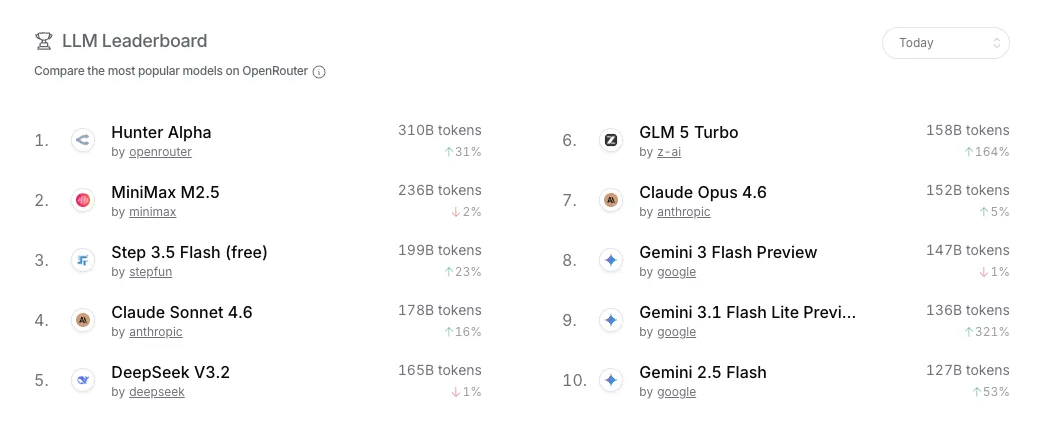 Then, on March 11, an anonymous 1-trillion-parameter model called "Hunter Alpha" appeared on OpenRouter with no developer attribution. The model climbed to the top of OpenRouter's leaderboard, surpassed one trillion tokens in total usage, and immediately triggered widespread speculation that it was DeepSeek's unreleased V4.