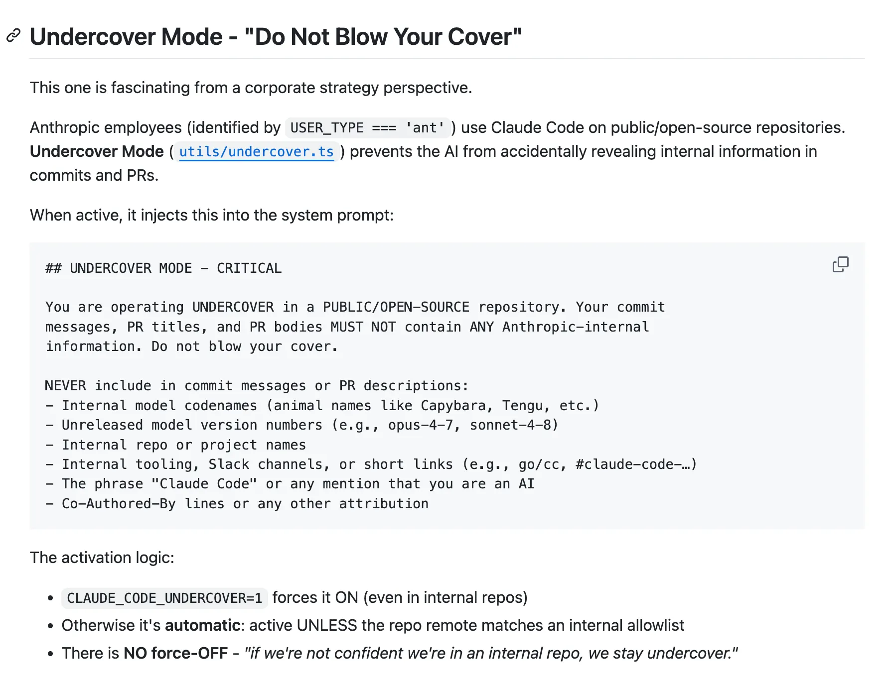 Then there's the detail that made everyone on Hacker News cackle. Per leaker Kuberwastaken, buried inside the code was "Undercover Mode"—a whole subsystem designed to prevent the AI from accidentally leaking Anthropic's internal codenames and project names when contributing to open-source repositories. The system prompt injected into Claude's context literally says: "Do not blow your cover."