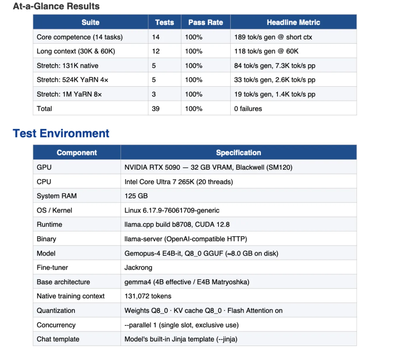 The smaller E4B variant passed all 14 core competence tests—instruction following, coding, math, multi-step reasoning, translation, safety, caching—and cleared all 12 long-context tests at 30K and 60K tokens. On needle-in-haystack retrieval, it passed 13 out of 13 probes including a stretch test at one million tokens with YaRN 8× RoPE scaling.