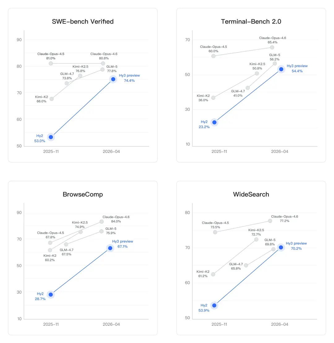 On coding, the improvement is dramatic. SWE-bench Verified is a benchmark that tests whether a model can actually fix real bugs from GitHub repositories—not toy problems, but production code. Hy2 scored 53.0%. Hy3 preview scores 74.4%. That's a 40% jump in one generation, landing it in range of Claude Opus 4.6 (80.8%) and above GLM-5 (77.8%) and Kimi-K2.5 (76.8%). Terminal-Bench 2.0, which measures autonomous task execution in a real command-line environment, went from 23.2% to 54.4%—also a massive leap.