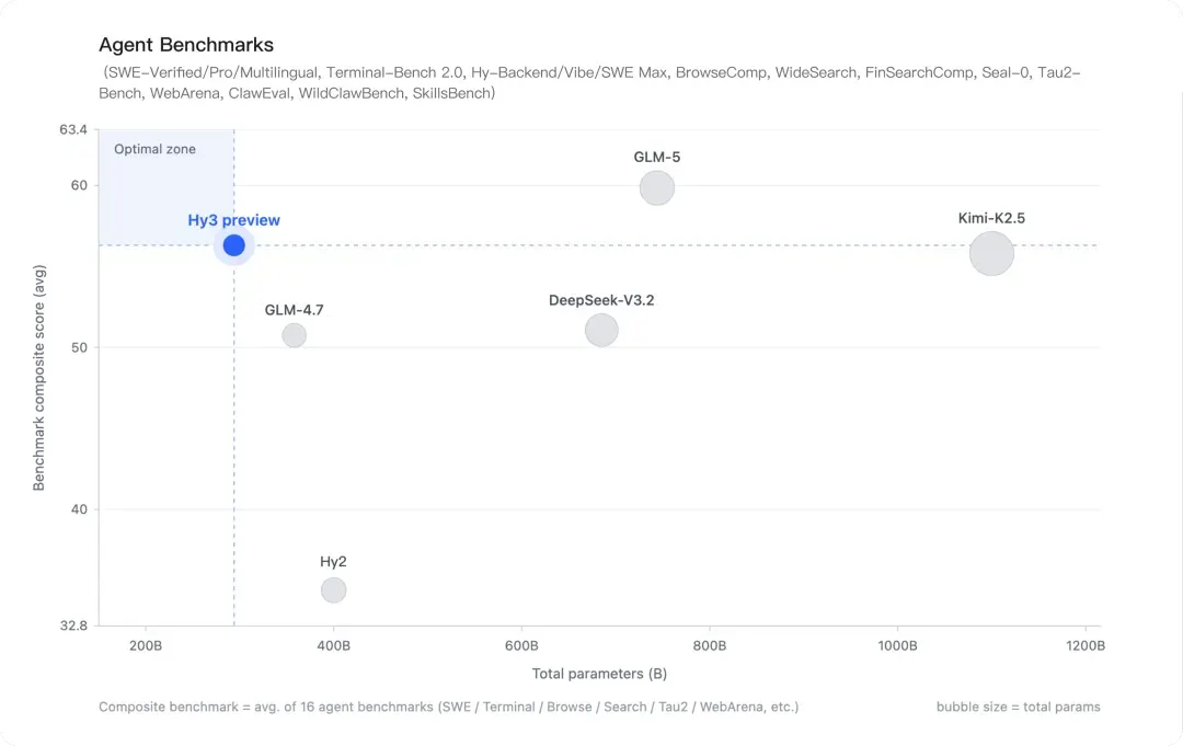 Hy3 still trails OpenAI and Google DeepMind's flagships, but by the size-to-performance ratio, Hy3 preview is hard to dismiss: the agent benchmark composite shows it in the "optimal zone" with ~295 billion parameters, ahead of DeepSeek-V3.2 (600 billion+) and matching Kimi-K2.5 (over 1 trillion parameters) at a fraction of the compute cost.