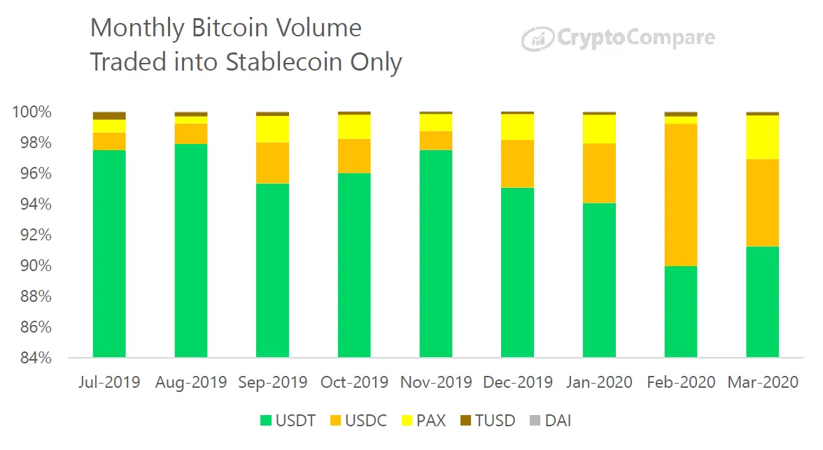 According to date from CryptoCompare, traders bought 21 million BTC with USDT during March which means it represents 73% of total BTC traded into fiat.