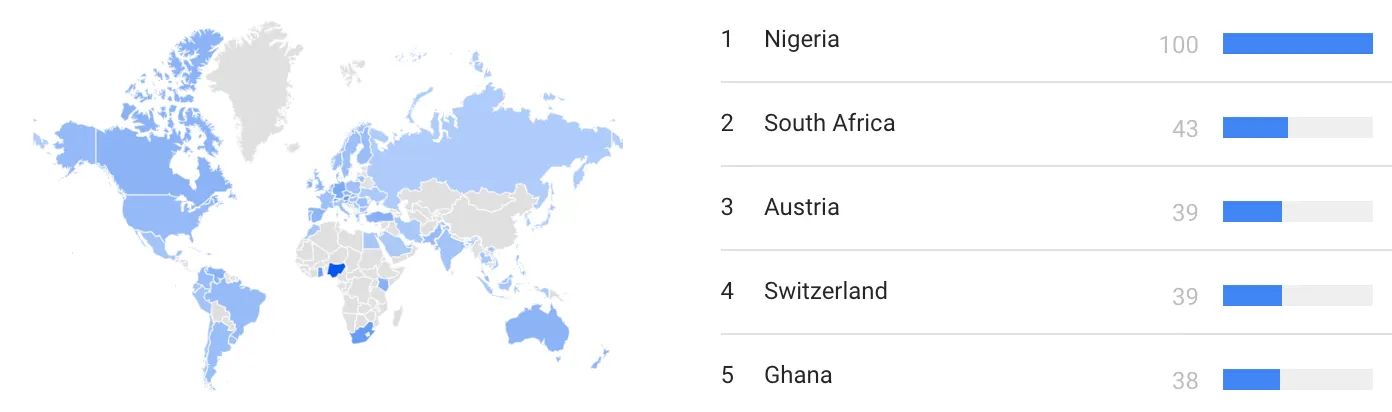 Nigeria, South Africa, Australia, Switzerland, and Ghana were the top five regions by Bitcoin search volume this year.
