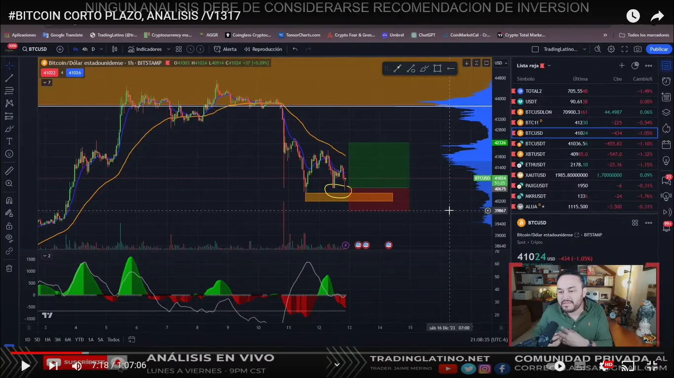 En su programa de ayer, TradingLatino señaló que la mejor entrada en Bitcoin al alza, en temporalidades de una hora, estaría en los $40.600, con un stop loss (venta automática para protección de capital en caída de precios) en $39.800 aproximadamente y un take profit o toma de ganancia (venta automática para proteger ganancias en una subida de precios) en $42.300.
