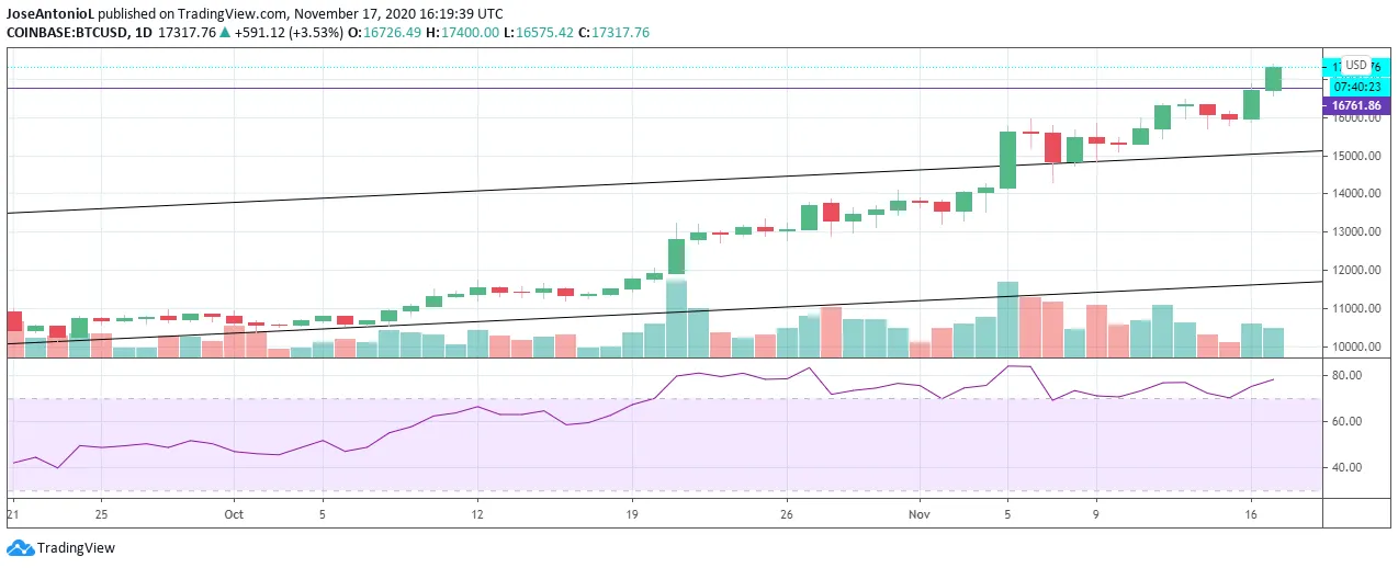 El precio de Bitcoin se ha disparado hoy hasta alcanzar los 17.000 dólares, una cifra no vista desde enero de 2018. Hoy ha subido un 4%.