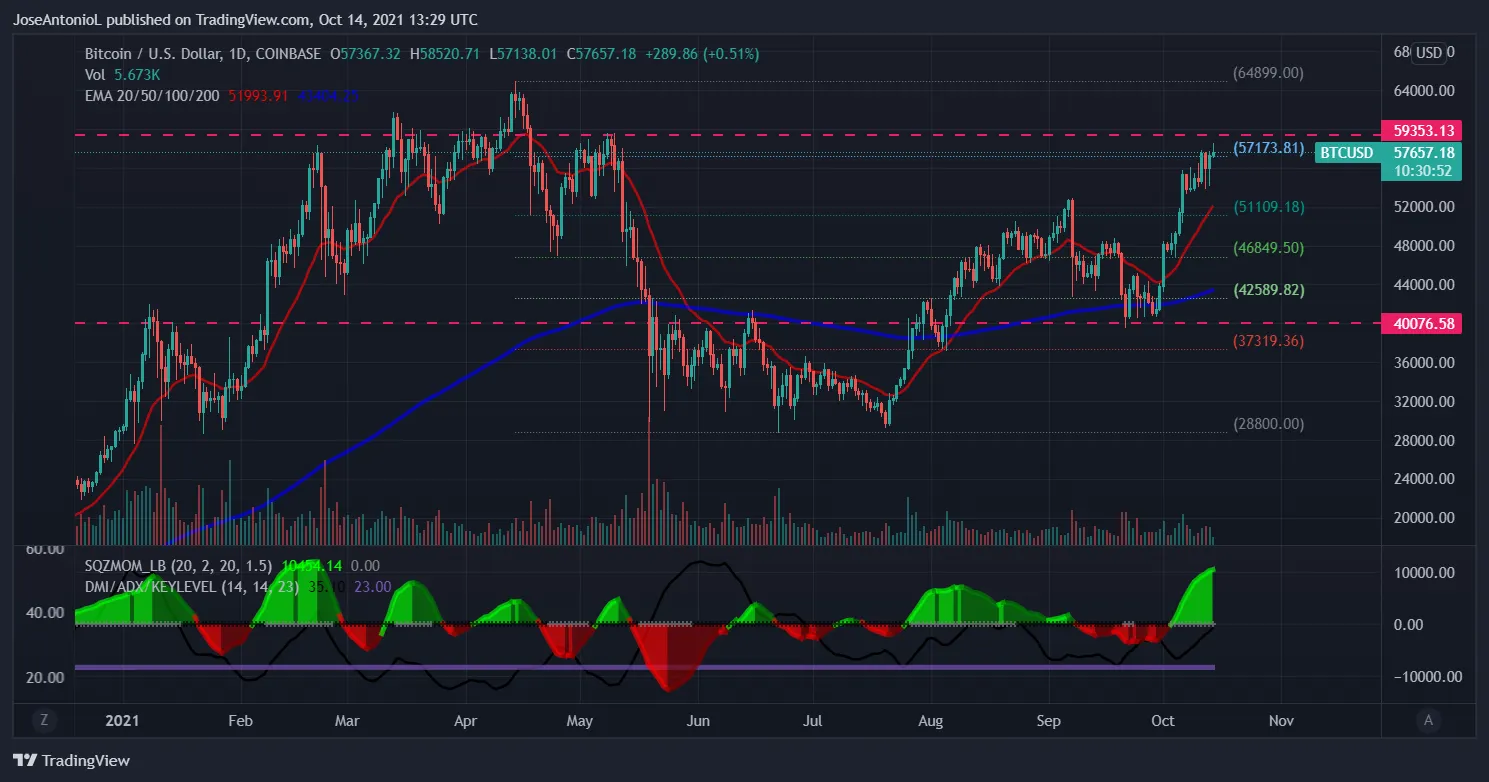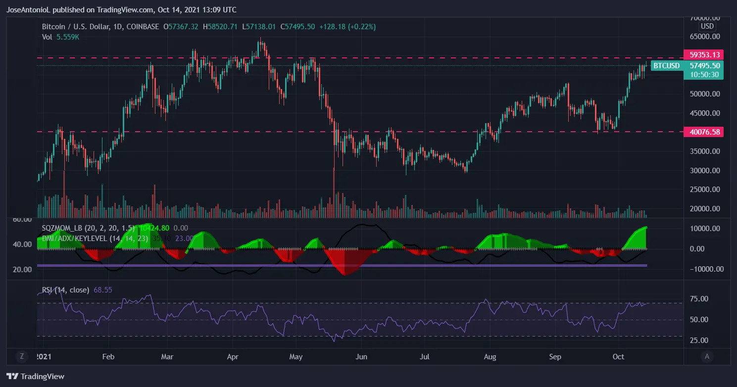 Más allá de este indicador, una resistencia histórica de precios ha sido la zona de los $59.000. Durante todo 2021, Bitcoin ha luchado para sobrepasar esta línea, fallando en al menos cinco oportunidades, inclusive en los tiempos de euforia de inicios de año. Si Bitcoin mantiene el ritmo, podría experimentar esta resistencia en las próximas horas o días.