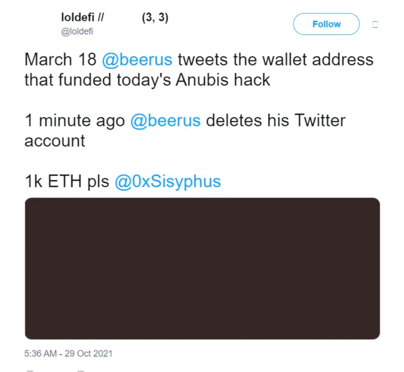 El diseñador de marcas de criptomonedas @loldefi respondió citando un tuit del 18 de marzo de una cuenta llamada @Beerus. Beerus había mencionado la dirección a la que se enviaron los fondos robados. La cuenta de Beerus desapareció de Twitter un minuto después.
