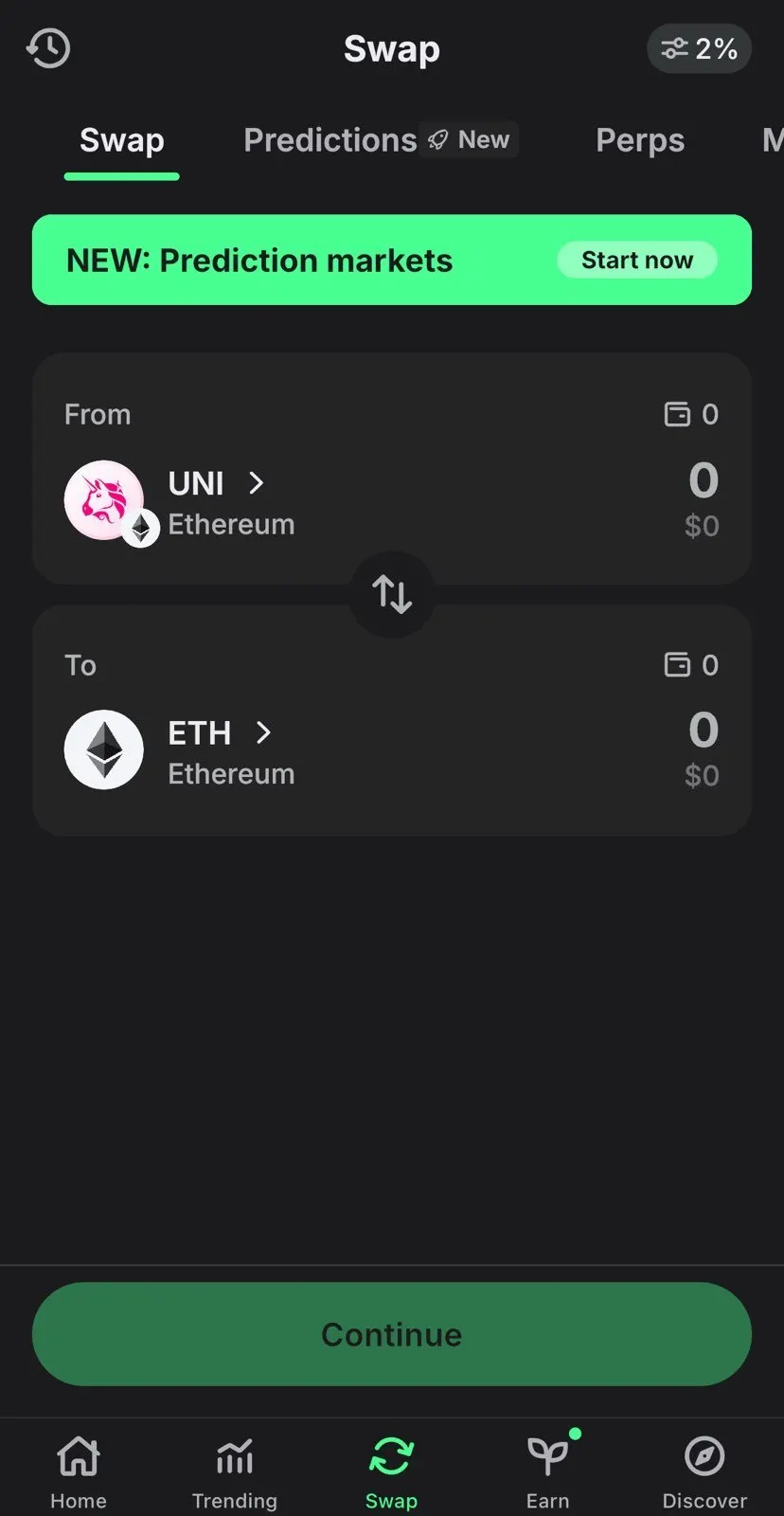 To get started with Predictions on Trust Wallet, simply fund your wallet as normal and head to the Swaps tab, then click on Predictions: