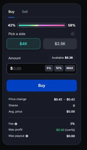 Regardless of how you’re viewing a prediction market, participating is simple: simply click the button under the market corresponding to the outcome you think is more likely to happen, and type in the number of USDC you want to use. There are buttons for 5%, 10% or MAX (100%) of your holdings. Once you’re happy with the amount, click the button below the market to make your prediction.